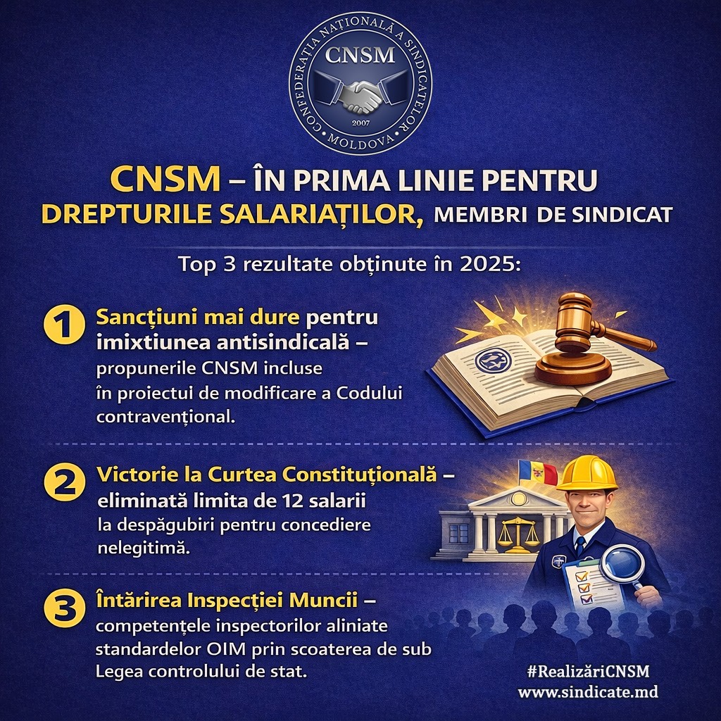 Confederația Națională a Sindicatelor din Moldova a obținut în anul 2025 progrese importante în consolidarea protecției juridice a salariaților, membri de sindicat, prin promovarea unor modificări legislative esențiale, decizii favorabile ale Curții Constituționale și inițiative menite să asigure respectarea drepturilor sindicale și a standardelor internaționale ale muncii.