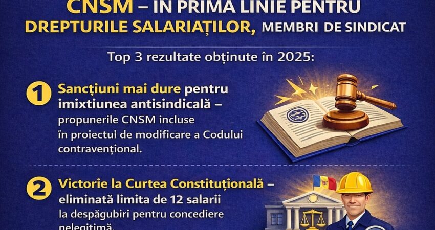 Confederația Națională a Sindicatelor din Moldova a obținut în anul 2025 progrese importante în consolidarea protecției juridice a salariaților, membri de sindicat, prin promovarea unor modificări legislative esențiale, decizii favorabile ale Curții Constituționale și inițiative menite să asigure respectarea drepturilor…